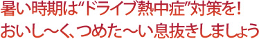 “ドライブ熱中症”にならないためにも、SAを有効に利用して、休憩することです。そのときに、冷たく、おいしいもので水分補給できたら言うことありませんね。
