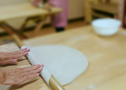 ダマを細かくして、体重をかけながら水をなじませて玉状に。麺棒を使って玉状から薄く伸ばしていく。均一になるまで伸ばしたら、それを重ねて麺切り包丁で切って仕上げる。