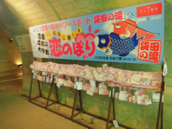 「恋愛成就の大作戦 絵馬に願いを 恋のぼり 袋田の滝」と、看板に描かれています。しかも、サブタイトルには「ようこそ恋愛の即効パワースポット袋田の滝へ 恋人の聖地」とあります。