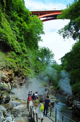 小安峡は皆瀬川の急流が長年にわたって両岸を侵食してできた深い渓谷である。駐車場にクルマをとめて遊歩道の長い階段を下る。やがて、周囲から聞こえる「シュー、シューッ」という音が大きくなってきた。