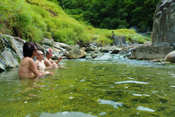 沢のやや上流にある湧出口から湧き出た源泉を堰き止めただけの天然の川風呂だ。源泉は98度と高く、とても入れるものではないが、美しい清流の水が混じり、7月~9月だけの限定野天風呂となる。