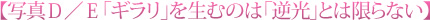 前回、写真撮影の際の光線状態が大切であることを解説した際に「逆光」「順光」のうち「逆光」がメリハリを生むと解説しました。しかし、今回の「ギラリ」写真の場合は「逆光」がいいとは言い切れません。写真D/写真Eはその例です。
