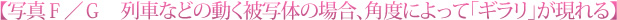 ほぼ逆光状態に近い写真F/写真Gですが、写真Fの列車は輝きを発していないのに対し、写真Gの列車は側面が光り輝き、同時に列車の屋根の部分がハッキリ見えたことで、その部分も輝きを放ち、存在感が引き立っています