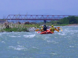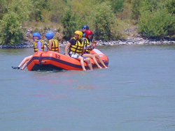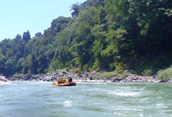 ガイドのかけ声でパドルを操作し、ボートに推進力を付ける。激流ポイントではパドルは少々お休みし、流れに身を任せる。ボートが上下に大きく弾み、油断していると落ちそうになる。