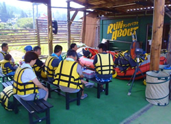 予約した参加者が集まると、ガイドによる講習が始まる。各自、ラフティング時の注意事項を頭にたたき込む。パドルの使い方を覚え、ボートから落ちたときの対処法を知る。