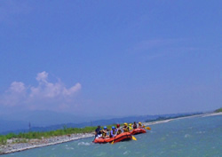 天竜川ラフティングの最大のセールスポイントは、国内最長級の13kmにおよぶ距離だ。事前講習などが約30分、スタート地点への移動が20分。そして、2時間のラフティングとなる。