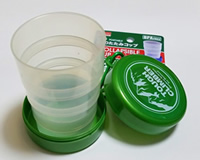 通常はヨーヨーのようなサイズとかたち。上蓋を開けて、内部を引き出せば200mlが入るコップになります。カラビナも付いているので、ズボンなどにぶら下げて持ち運びできます。