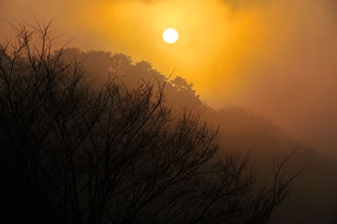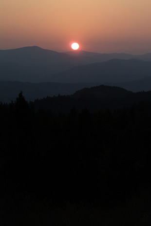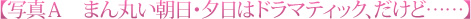 写真Aは7月下旬に三重県の伊勢志摩スカイラインの展望台に立ち寄った際に遭遇した夕日です。この日は、異例と言われた東から西へ移動した台風12号を追いかけるように西に向かいました。三重県には温かく湿った空気が次々と流れ込み、山では次々と雲が発生するといった天候でした。そんななか、雲間を割って突然夕日が現れ、その瞬間を写したものです。