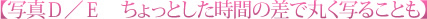 煌々と輝く太陽も、少しの時間経過で光が弱まり、その形を写し撮れることもあります。写真Dと写真Eはその例です。写真Dを撮影してから約3分後に光が急に弱まり、丸く写ったという例です。