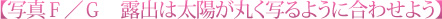 画面に入るほかの被写体との兼ね合いもありますが、概ねマイナス0.5~1.5程度にしておくと、太陽の輪郭がクッキリ丸になって写ります。写真Fも写真Gもマイナス補正をして撮影しました。何段階かのマイナス補正を試してみてください。