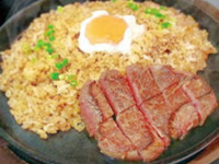 こちらのガーリックライスは茨城米を使用、タマゴが上にのっています。ジュッと音をたてるビーフも極上です。コストパフォーマンスがいいメニューです。