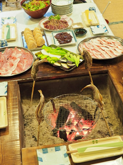 いろり端で食べる夕食は、畑で育った野菜であり、いろりの遠赤外線を利用して焼いた川魚、イノシシやシカの肉。食べたい食材をいろりで焼いて食べる。