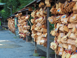 谷保駅(駅の名前は「やほ」です。不思議ですね)側の駐車場から鳥居をくぐって石段を降り、車祓所から拝殿に向かうと、右側にものすごい数の絵馬が架かっているのに気づきます。