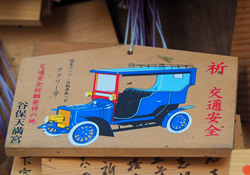 それらの絵馬の中で断然目立っているのが交通安全絵馬です。そこにはブルーのタクリー号が描かれていました。