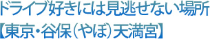 多摩川を臨む立川段丘に位置する谷保天満宮は、東日本最古の天満宮です。菅原道真の三男・道武が父を祀るために建立したのが903年のことだと伝わります。そして、この天満宮こそ、ドライブ好きならぜひ訪れたいパワースポットなのです。
