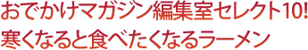 通年で人気のラーメンですが、とくに寒い季節になると「ラーメン欲」が増すのはおでかけマガジン編集室スタッフに限ったことではないと思います。そこで、編集室スタッフと出入りするライター、カメラマンによる「お気に入り」をご紹介します。立ち寄ったならぜひ!