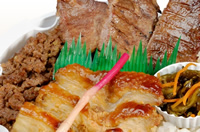 宮城名物の牛タンと伊達鶏を豪快に乗せたお弁当です。このお弁当はリニューアルされて現在では以前に比べて牛タンが1.5倍厚くなり、さらに枚数も2枚から3枚へ増量。牛タンは醤油の香ばしい味付け、鶏は味噌焼きになっています。