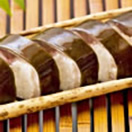 サバのうまみと柿の葉の香りが染み込んだ、ご存じ奈良県の名物寿司。海の幸と山の幸が一体となりました。柿の葉は保存効果もあるようです。