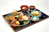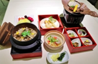 石川県が新たに生んだブランド米「ひゃくまん穀」を利用したお膳。日本海の魚介類などが米のうまみを引き立てています。器に九谷焼や山中漆器を使うなどこだわりたっぷりです。