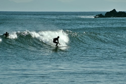 こんな練習がしばらく続いた。やがて、両足で立ち上がることにも成功。いい気分で波に乗った。だが、腕の筋肉に限界が来た。