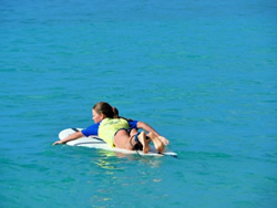 コーチと共に海に入れば楽に波に乗れる