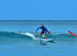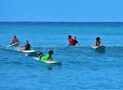 ワイキキの海にコーチと共に入り、コーチのかけ声でパドリングを開始し、これまたかけ声でボードの上に立つ。