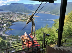 湖畔に山麓駅がある河口湖富士山パノラマロープウェイは、「カチカチ山ロープウェイ」と呼ばれる。ウサギとタヌキが柴狩りに行った天上山山頂の公園まで5分足らずで上る。また、昔話で“海”と称された河口湖は山上から一望できる。そして、目の前に富士山がそびえる。山上からは360度の展望が楽しめるのだ。