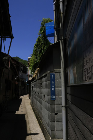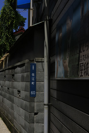 一見したところこの写真においては邪魔になりそうな場所でしたが、陰になって完全に潰れて見えないため、かえって映画看板や住居表示の部分を引き立たせるのに一役買ってくれました。