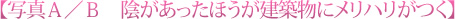 写真Aは順光で建物の壁全面に光りが当り、全体が明るいのに対し、写真Bはサイドからの光りで建物に陰影がつき、しかも日陰になっている右側の壁も画面に取り込んでいます。