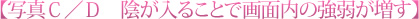 このように、画面全体に目が行くのではなく、狙った部分に目が行くようにするために、陰を生かして画面に濃淡をつけることが大切なのです。