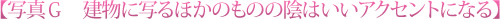 建物などを撮影しているときにぜひ注意して見てもらいたいのが、建物の外壁に写っている陰です。陰が描かれることで、建物がより印象的に見えるケースが少なくありません。 写真Gは、群馬県館林市の旧モスリン事務所の建物ですが、壁に木の陰が入ったことで壁自体にメリハリがつき、とても印象的な雰囲気に仕上がりました。