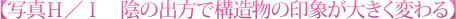 写真H/写真Iは、東京都北区にある旧岩淵水門を、写真Iは午前に、写真Hは午後に、ほぼ同じ位置から撮影したカットです。