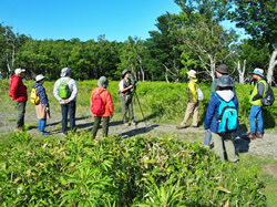 レクチャーの後、知床を歩き始める。植物や植生、飛んでいる鳥をガイドが解説する。