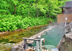 湯宿だいいちの前の川には、大きな岩が滑落して流れの中にささったところもあれば、アイヌの人々が長年に渡って居を構え、樹皮などを温泉に漬けて繊維を作った形跡も残る。