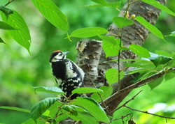ロビーの向こうの木にアカゲラ