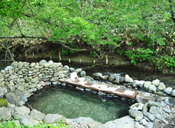 ●源泉温度:80度(熱い自噴泉が川の水と混じり適温に) ※自主管理のためにマナーを守って入浴のこと