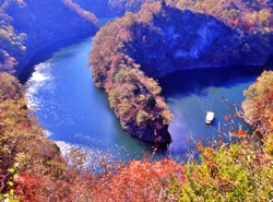 紅葉の神龍湖を行く遊覧船