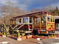 電車ではなくトロリーバスがあるのがここ。ワッフルやチュロスを販売する店舗でもありますが、このトロリーバスはアメリカ・サンフランシスコで実際に走っていた車両。明るく爽やかな那須高原にマッチしています。というわけで、Kカメラマンからは乗り物系のSAが推薦されました。