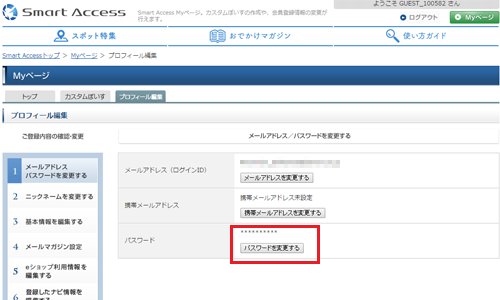 ・会員登録確認ページで表示していたパスワードを「現在のパスワード」欄に入力し、新しいパスワードを入力して「内容を確認する」ボタンを押します。